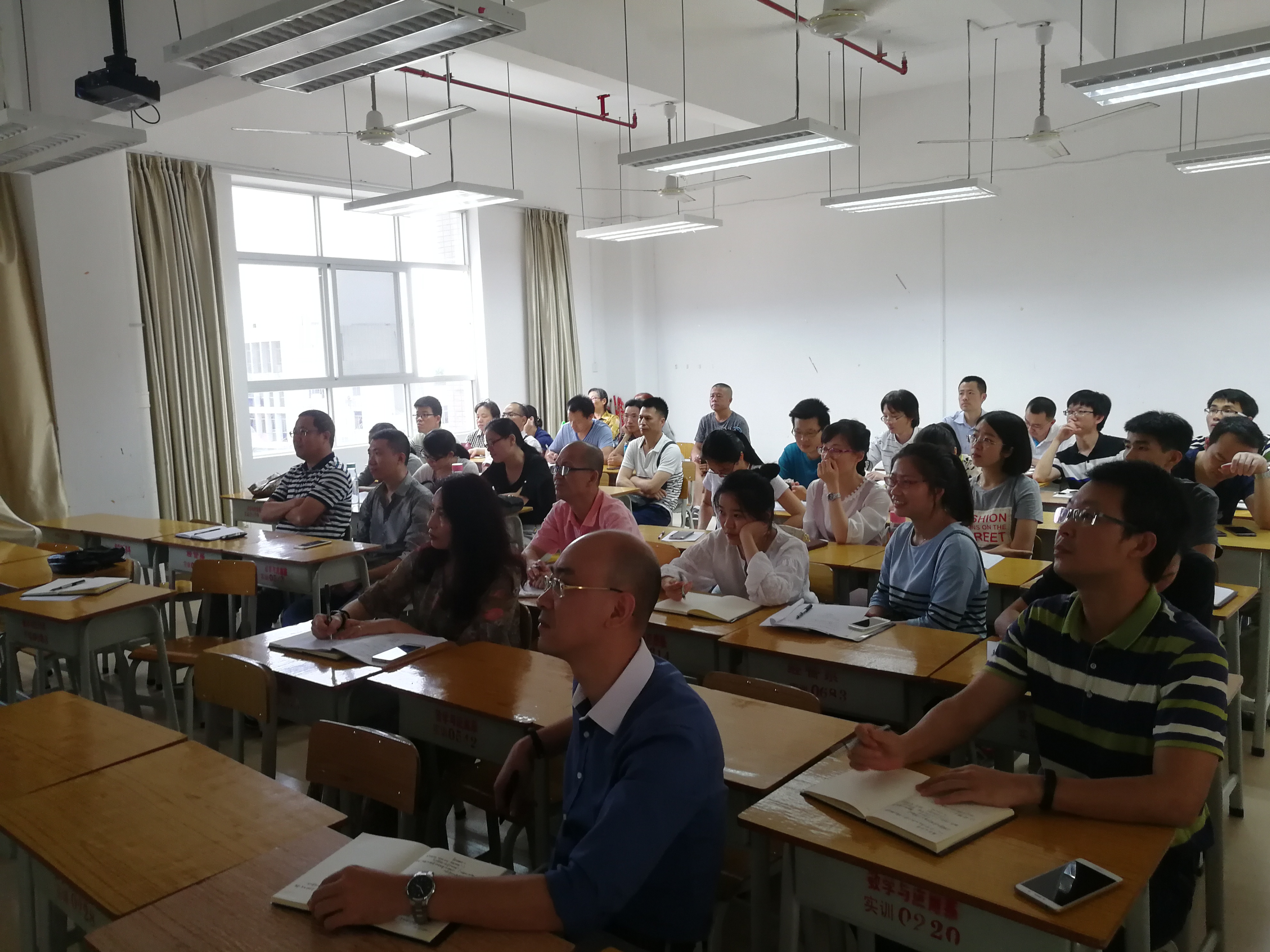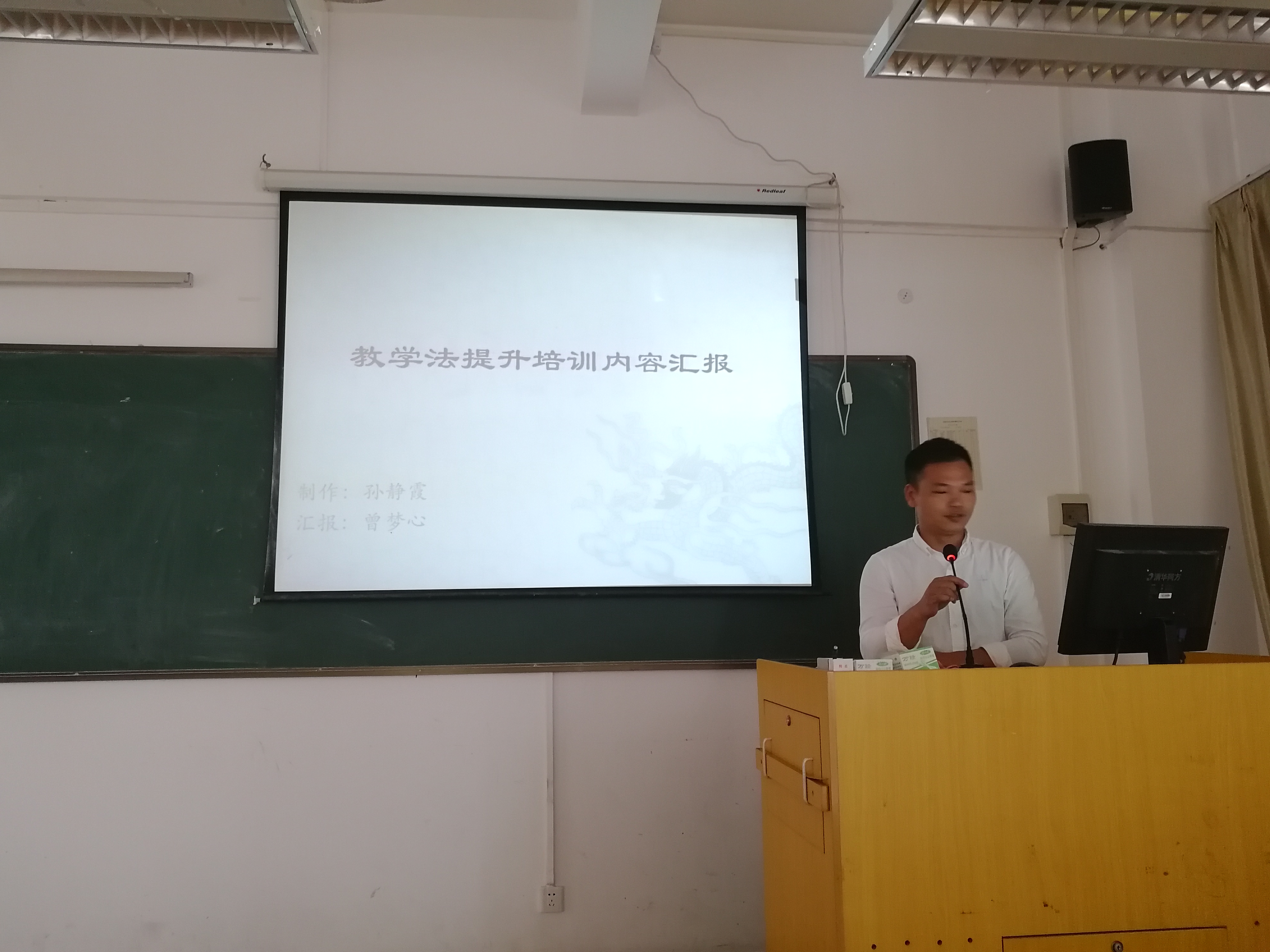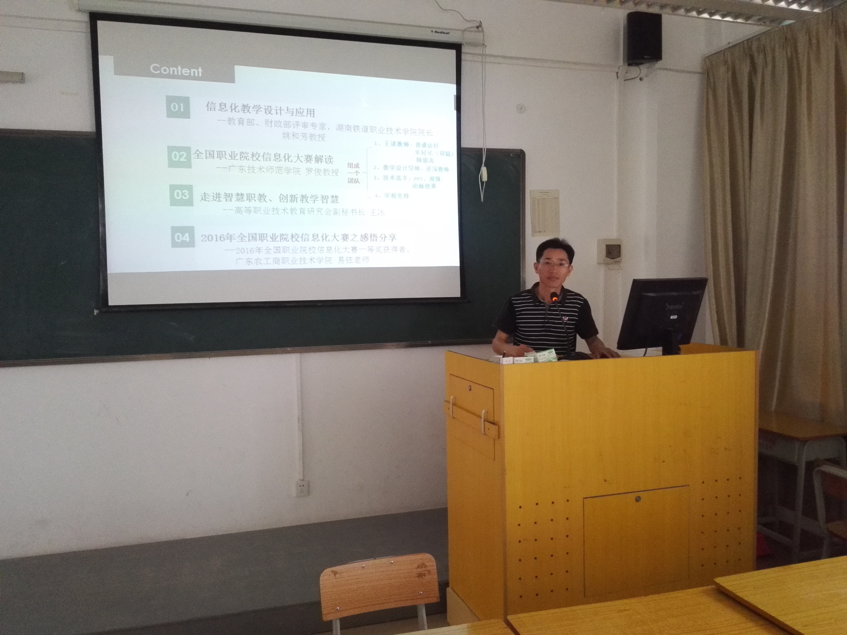 三位外出进修教师代表逐一汇报了学习期间的收获、感悟和建议。首先由赵娜就“国培计划(2016)专职培训团队研修项目”进行解读,重点介绍了培训项目的课程设计框架,主要由数学教育前沿、技术与学科整合、数学教师培训、实践活动与考察等四个方面进行详细的汇报;接着聂俊龙副教授分享了他参与“广东省高职教师信息化教学能力提升培训班”的学习体会,重点从信息化教学设计与应用、全国职业院校信息化大赛解读、走进智慧职教创新教学智慧及2016年全国职业院校信息化大赛之感悟分享等四方面进行解说。最后曾梦心老师就参与“教学法提升培训”做了学习汇报,他从课程管理、行为管理、交流与沟通到最后评价与反馈等进行汇报,分享了他的学习心得,让更多的教师认识到高职教育的教学圈(对象组-目标-教法-资源-评价-反思)。