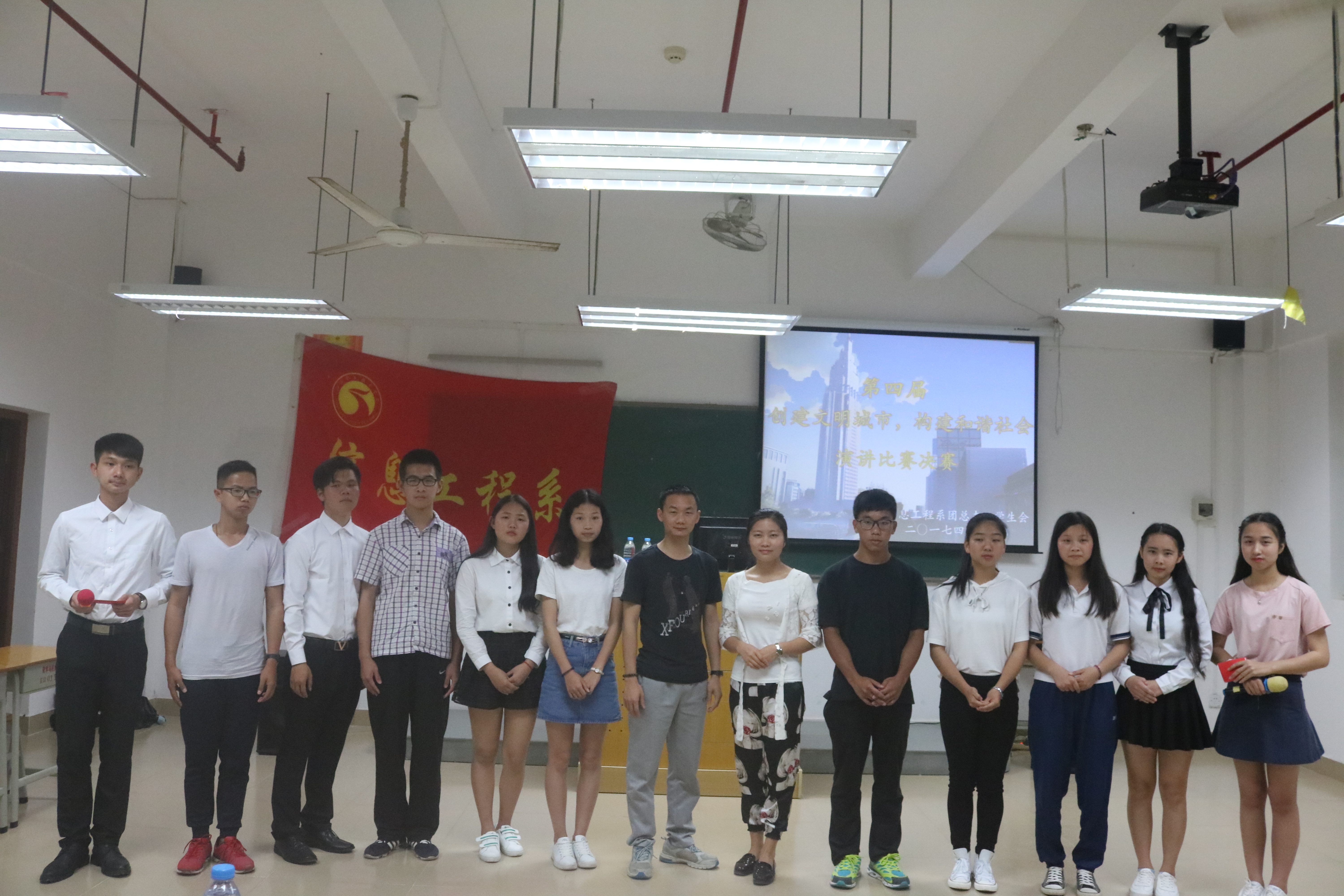 为展现当代青年员工朝气蓬勃,奋发进取的精神风貌,营造和谐校园文化氛围,积极引导和激励广大团员青年更好地传承“五•四”精神,践行社会主义核心价值观,为实现两个百年的中华民族伟大复兴的“中国梦”而努力奋斗。2017年4月20日晚在实训楼410教室,我系第四届演讲比赛圆满落下帷幕,演讲以“创建文明城市,构建和谐社会”为主题。本次比赛历经初赛和决赛,各班级参赛热烈,共有14名选手参加本次比赛,最终9位选手脱颖而出,他们凭借出色的口才、敏捷缜密的思维,微笑中彰显自信、幽默中不失气势等赢得观众的热烈掌声。